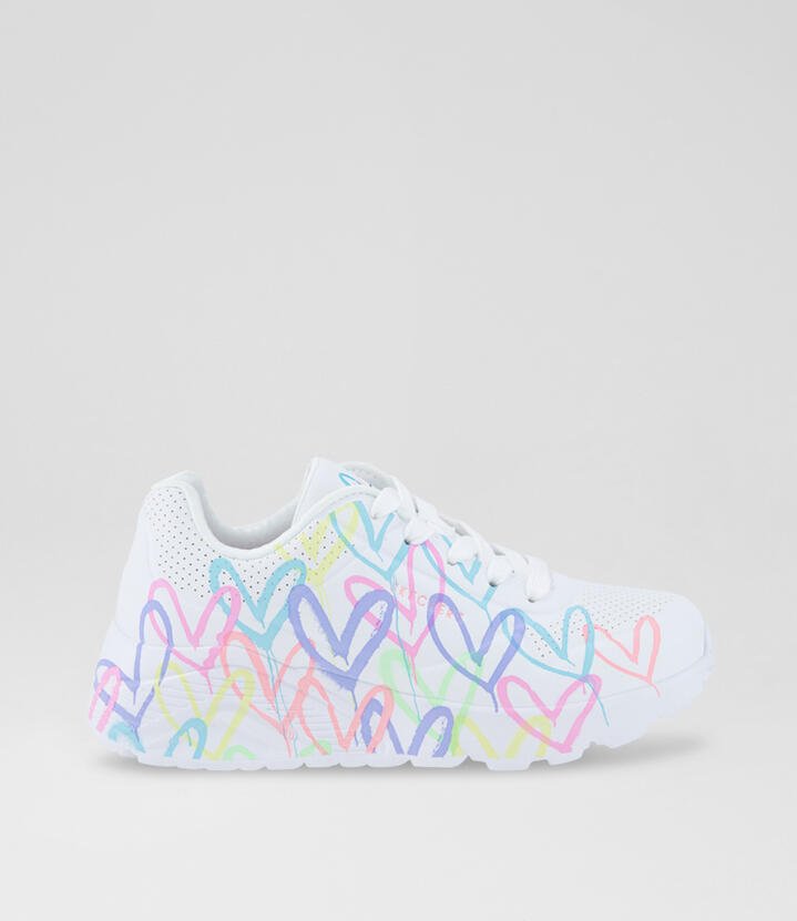Fun casual sneakers for little feet, the UNO LITE – SPREAD THE LOVE style is sure to bring a smile to young faces. A collaboration with muralist JGoldcrown, this fun Skechers style brings the artistÂ’s designs to life.