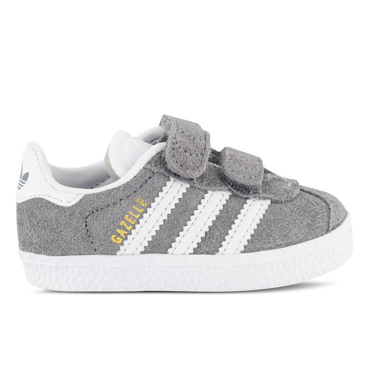 Toddler Gazelles with hook-and-loop straps. A wildly popular streetwear style since the ’60s, the Gazelle was originally made for football’s quick stop-and-start moves. These baby shoes are built for speedy transitions with straps to ease on and off. Soft suede makes them extra comfy.