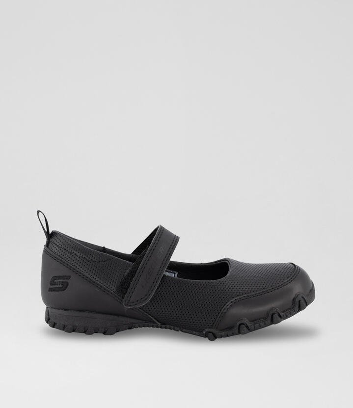 An Air-Cooled Memory Foam insole, flexible rubber traction outsole and durable leather upper make these mary jane uniform-ready shoes by Skechers a great-value, great-comfort option for busy, growing kids. Adjustable hook-and-loop closure for a precise fit. Air-Cooled Memory Foam insole. Leather upper. High-grip sole.
