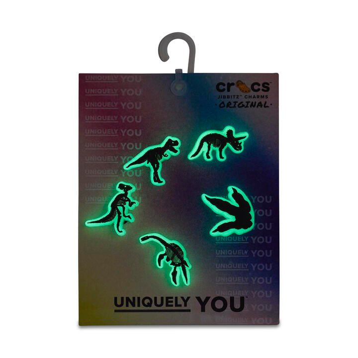 Pop some personality into your shoes with this Glow in the Dark Dino Jibbitz™ Charms 5 Pack. This pack is a must-have and the perfect addition to your favourite pairs of clogs, slides, and more.