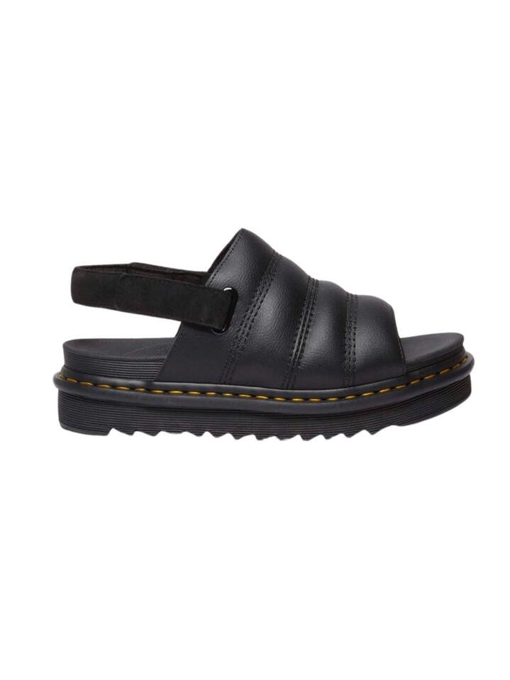 The Kole Sandal Athena in Black by Dr Martens features a pillow-soft padded upper and super-lightweight EVA sole. This sandal has molded SoftWair footbed, adjustable Ripstop strap and yellow welt stitching. Materials: Smooth PU coated leather with matte finish.