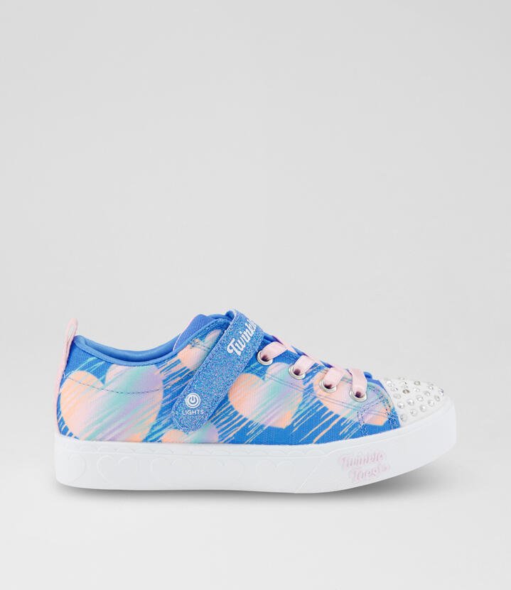 Light up every room with artful style wearing Skechers Twinkle Toes: Heart Steps. This heart-trimmed design features a shimmer fabric upper with ‘heart sketch’ print, stretch laces, adjustable instep strap, and a light-up rhinestone-embellished toe cap.