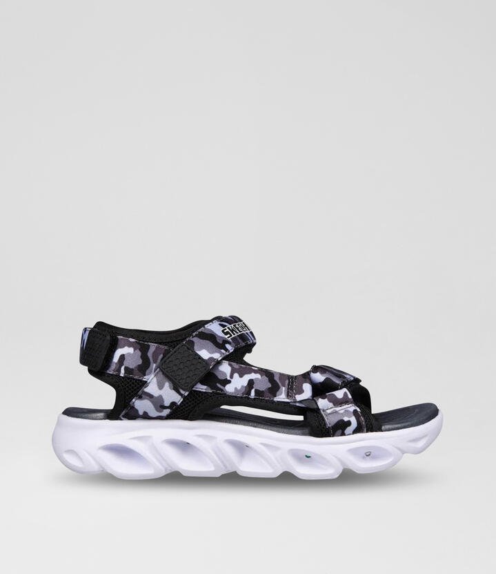 Bright fun rivals the sunny days when he wears the SKECHERS S Lights: Hypno-Splash – Sun Breaks sandal. Synthetic upper in a sporty light-up river style adjustabe sandal with camouflage print and multi light midsole.