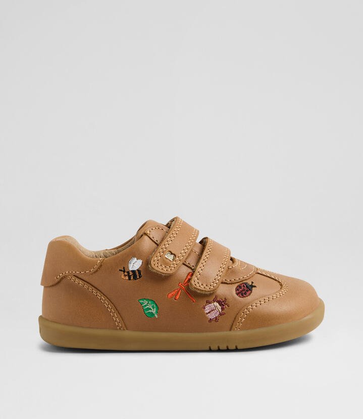 A wardrobe staple with added whimsy, it’s BUGGIE! Practical as well as cute, BUGGIE is crafted from Quickdry leather that has been embroidered with friendly garden critters, and is easy to whip on and off thanks to the double hook and loop straps. A padded ankle collar, leather lining and flexible sole add the finishing touch to what is sure to become their favourite pair of shoes. Suitable for confident young walkers.