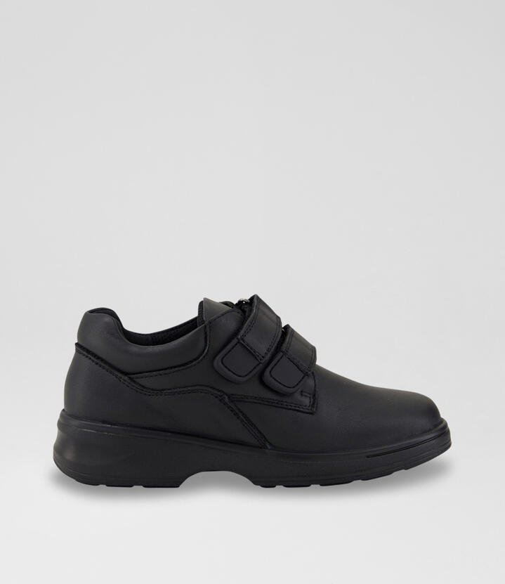 The Trybe’s Jem Velcro shoe features a double hook-and-loop design, perfect for little ones on the go for school. With easy adjustability and cushioning on the heel, these black school shoes feature a versatile sporty look.