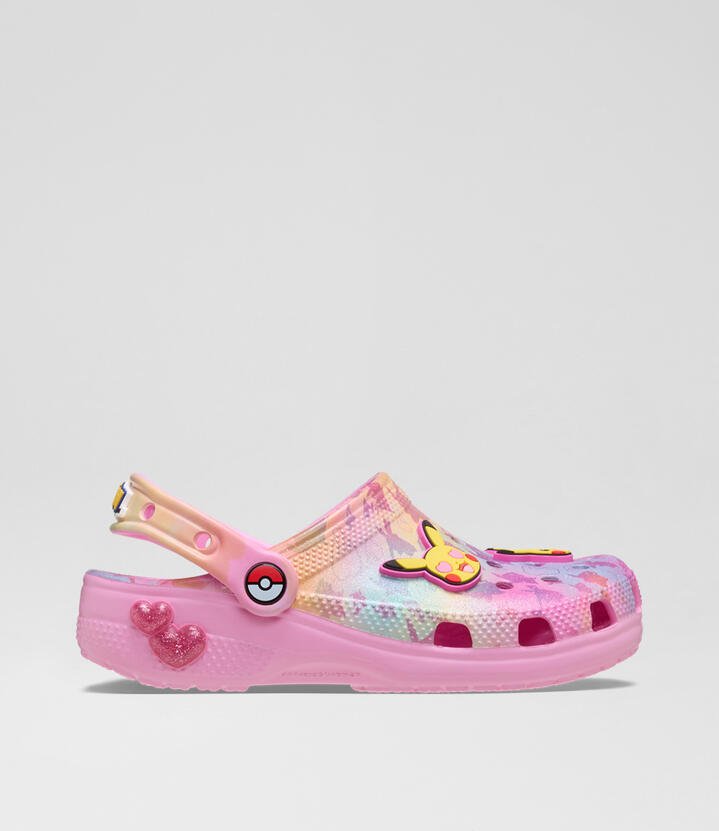 Calling young Trainers! This Classic Clog is a fan-favorite silhouette, printed with fan-favorite Pikachu. An all over shimmer finish with expression Jibbitz™ charms level up the look even more!