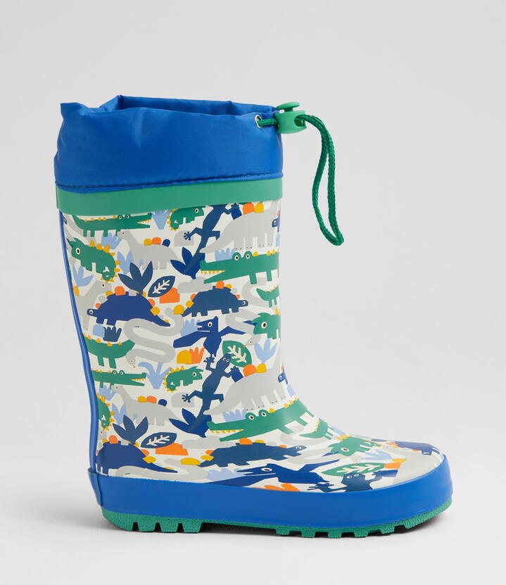 Puddles – Super fun and ultra-practical kids gumboots, designed with a durable waterproof upper and grippy rubber sole. Easy to pull on, a toggle fastening on the textile collar hugs the leg while the clever moulded kick trim at the back of the heel makes them easy to kick off too!