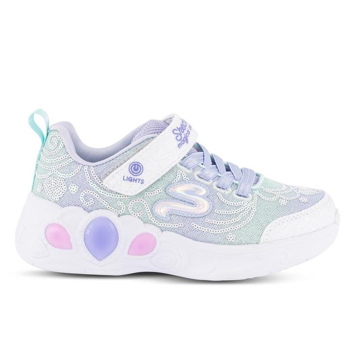 Light up your steps with royally cute style in Skechers S-Lights®: Princess Wishes. This sporty Magical Collection® themed design features a glittery mesh and sequin embellished upper with stretch laces, adjustable instep strap, cushioned comfort insole, and a light-up midsole. Bonus wand included as a gift with purchase.