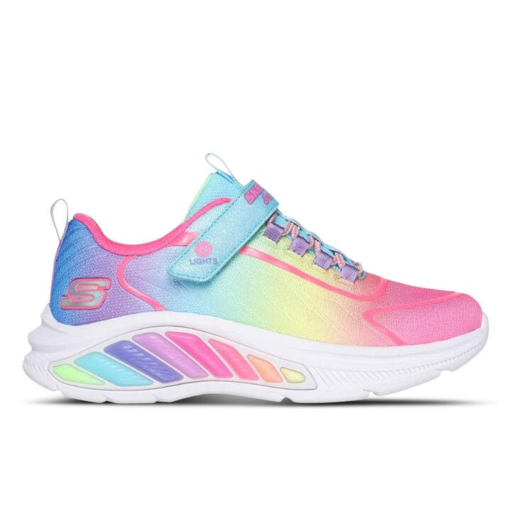 Shine bright in style the colourful Skechers Rainbow Cruisers. This lighted design features an ombre woven upper with stretch laces and an instep strap with an on/off button.