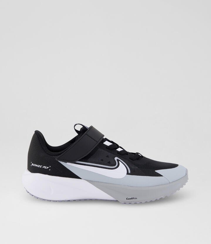 Nike Sonic Fly Little Kids’ Running Shoes Fuel their need for speed in the Nike Sonic Fly. Designed for fast runners in the making, it pairs a lightweight design with soft, springy foam that helps add energy to every stride. Responsive Cushioning We packed the midsole with soft and springy foam that absorbs impact and adds energy to your kiddo’s every stride. Lightweight But Durable Less weight means more speed. Mesh throughout the upper helps keep these shoes lightweight and breathable. We reinforced the toe and sides for added durability. Support They Can Feel A stretchy band under the laces helps add stability and containment. Rubber outsole with Waffle-inspired tread pattern helps provide durable traction. Elastic laces and a hook-and-loop strap make these shoes easy to take on and off.