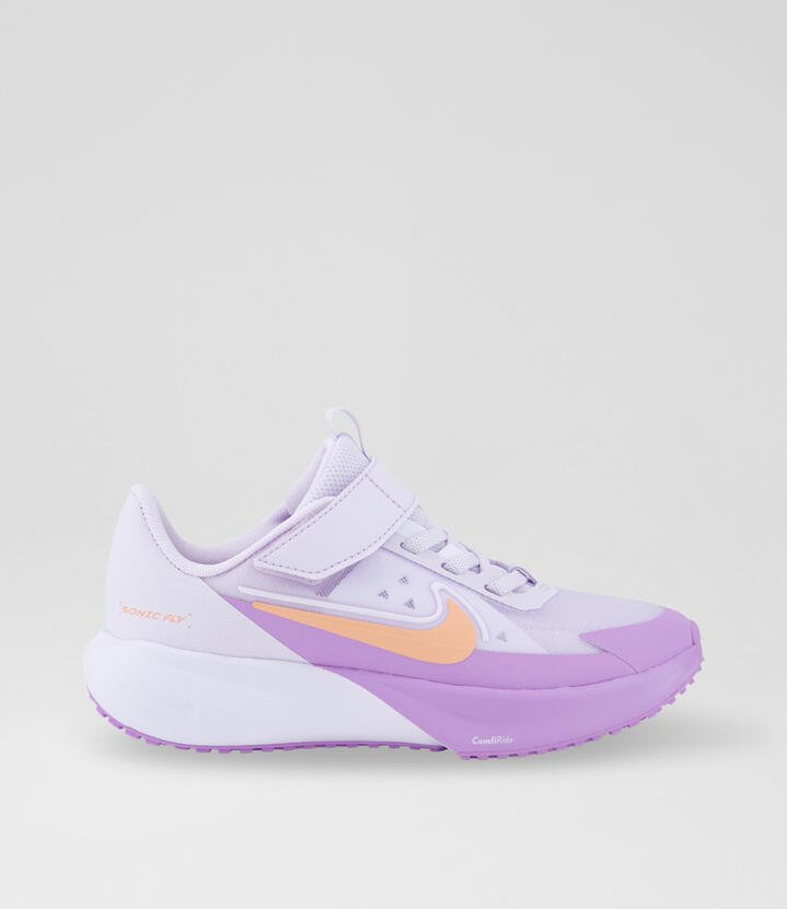 Nike Sonic Fly Little Kids’ Running Shoes Fuel their need for speed in the Nike Sonic Fly. Designed for fast runners in the making, it pairs a lightweight design with soft, springy foam that helps add energy to every stride. Responsive Cushioning We packed the midsole with soft and springy foam that absorbs impact and adds energy to your kiddo’s every stride. Lightweight But Durable Less weight means more speed. Mesh throughout the upper helps keep these shoes lightweight and breathable. We reinforced the toe and sides for added durability. Support They Can Feel A stretchy band under the laces helps add stability and containment. Rubber outsole with Waffle-inspired tread pattern helps provide durable traction. Elastic laces and a hook-and-loop strap make these shoes easy to take on and off.