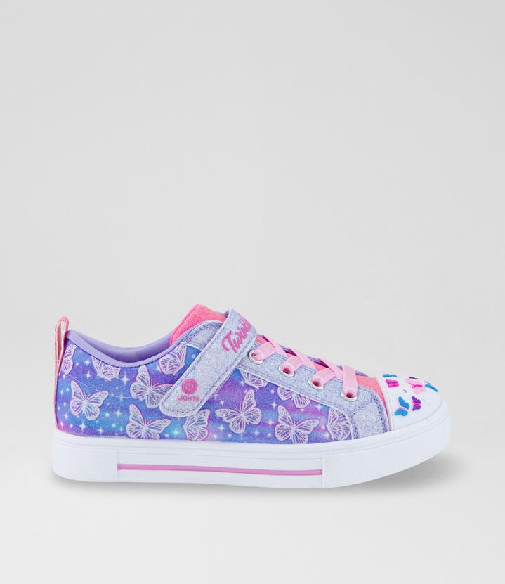 Take to the skies in magical style wearing Skechers Twinkle Toes®: Twinkle Sparks – Ombre Flutter. This glittery lighted design features a rainbow print synthetic upper with butterflies, stretch laces, adjustable instep strap, and a butterfly embellished toe cap.
