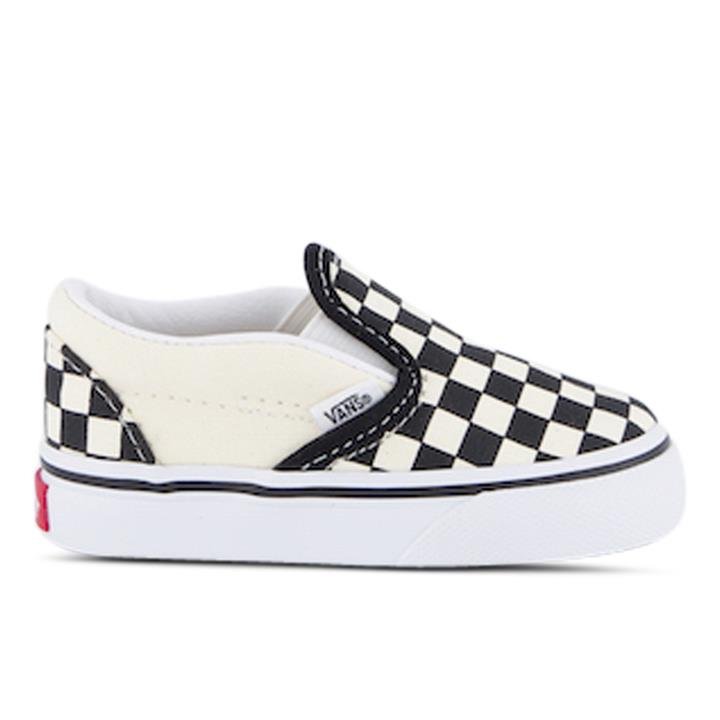 The Toddler Classic Slip-On has a low profile, slip-on canvas upper with all-over checkerboard print, elastic sides with foxing stripe and outsole details just like the original.