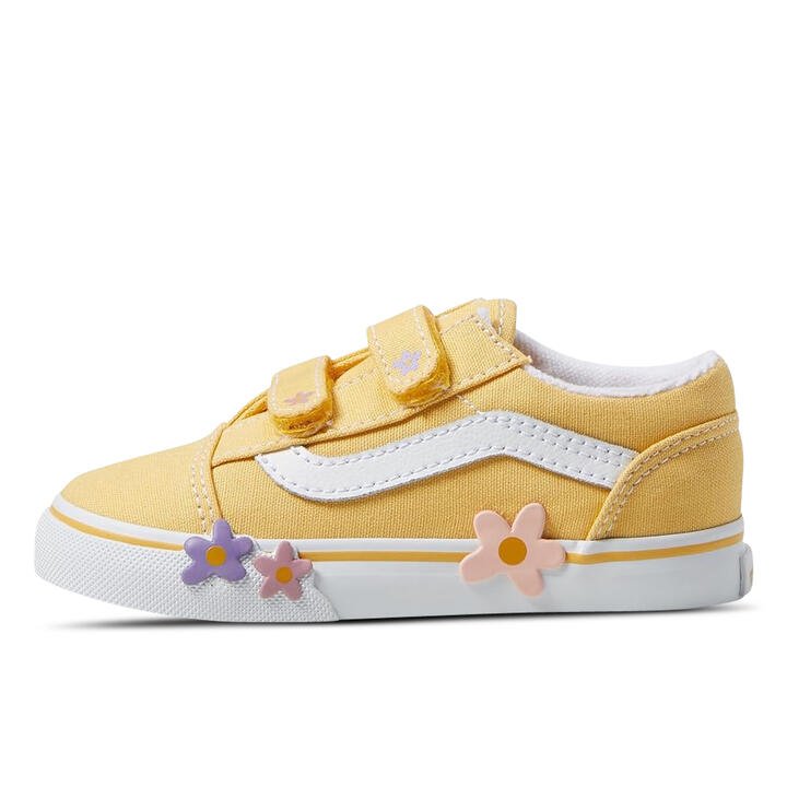 The Old Skool V reimagines Vans iconic Sidestripe shoe by swapping traditional laces for double hook-and-loop closures. Made with signature canvas uppers and featuring flower appliques along the sidewalls, this low-top style maintains its classic appeal while providing an easy, secure fit that will keep your little one comfortable all day.