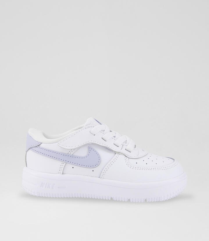 The look of laces without the struggle of having to tie them? Now, that’s easy. The laces on these sneakers are just for showthe top two lace loops are attached to a hook-and-loop strap so kids can fasten them fast while still enjoying the traditional look of the AF-1. But these shoes aren’t just easy for kids to put on. We designed them around kids’ feet for overall comfort too.