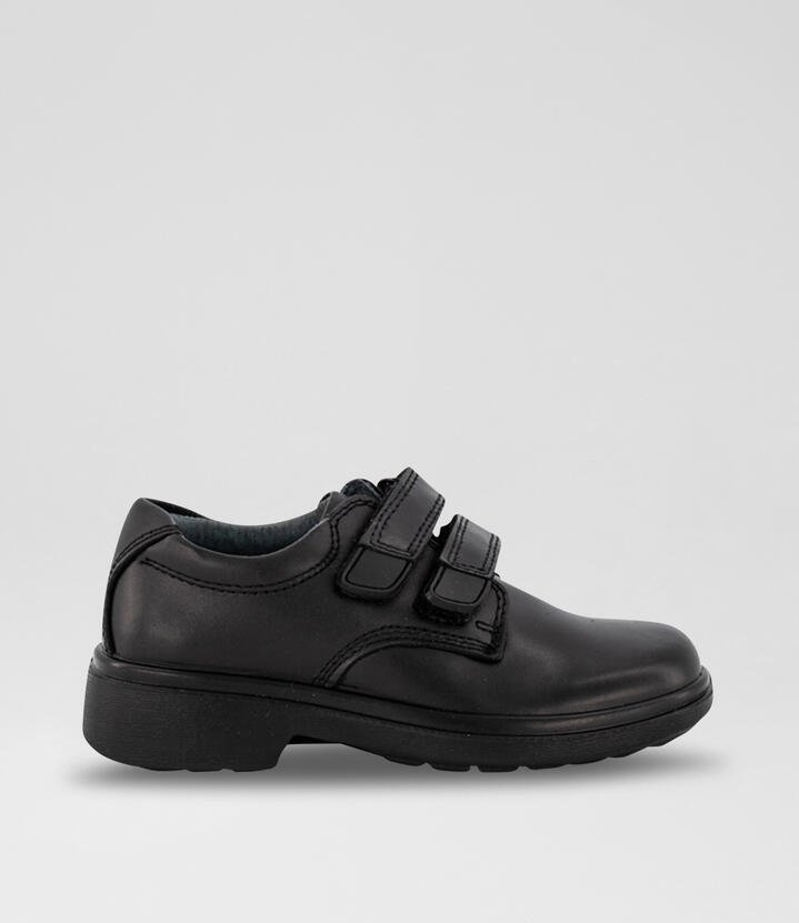 Be smart for school with the classic Denver shoe. The black leather upper features self fastening straps with a rubber tab to stop it from fraying when legs are crossed.