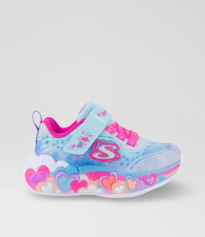 Sporty style gets lit-up and lovable with Skechers S-Lights®: Eternal Heart Lights. This lighted design features a sparkle mesh and synthetic glitter upper with stretch-laced front, and a Skechers adaptive closure.