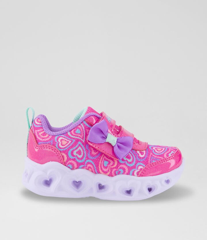 Sparkle and shine in magical delight wearing Skechers Heart Lights®. This light-up design features a heart print mesh upper with synthetic overlays, an adjustable instep strap closure with bow accent, and a heart sculpted light-up midsole.