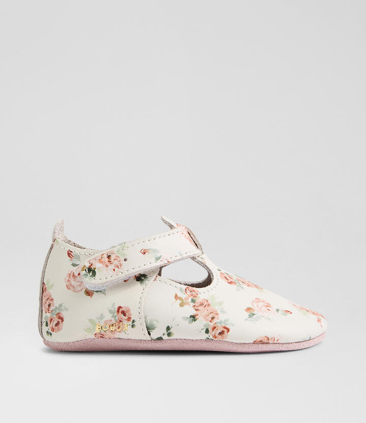 Tiny toes will blossom with these leather T-bar baby shoes from Bobux. Crafted in collaboration with Australian brand Snuggle Hunny, ROSEBUD T-BAR is made from petal-soft leather that lets wriggling feet flex and move. Delicately detailed rose illustrations and a blushing pink suede sole make this sweet style perfect for special occasions.