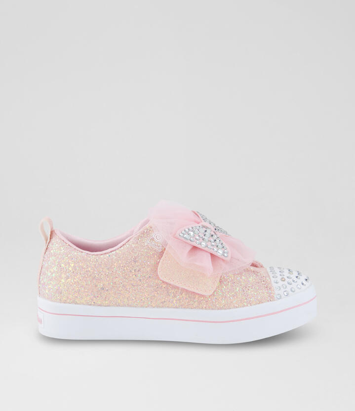 Light up their little world with Skechers Twinkle Toes®: Twi-Lites 2.0. This sparkly design features an allover glitter upper with a light-up rhinestone embellished toe cap and closure strap with a tulle and rhinestone embellished bow.