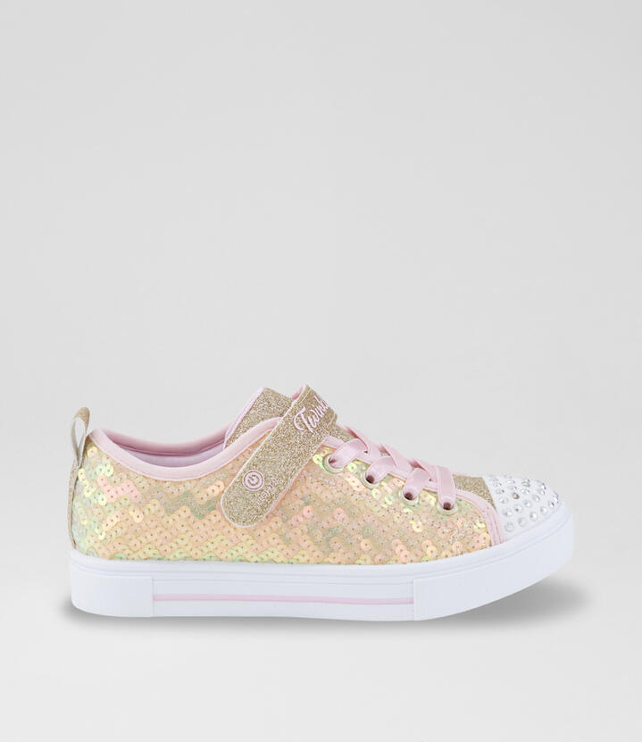 Light up your steps with shimmering style in Skechers Twinkle Toes®: Twinkle Sparks – Magical Ombre. This lighted sneaker features a magical themed print on a synthetic upper with glitter trim, stretch laces, Skechers adaptive closure, and a rhinestud embellished toe.