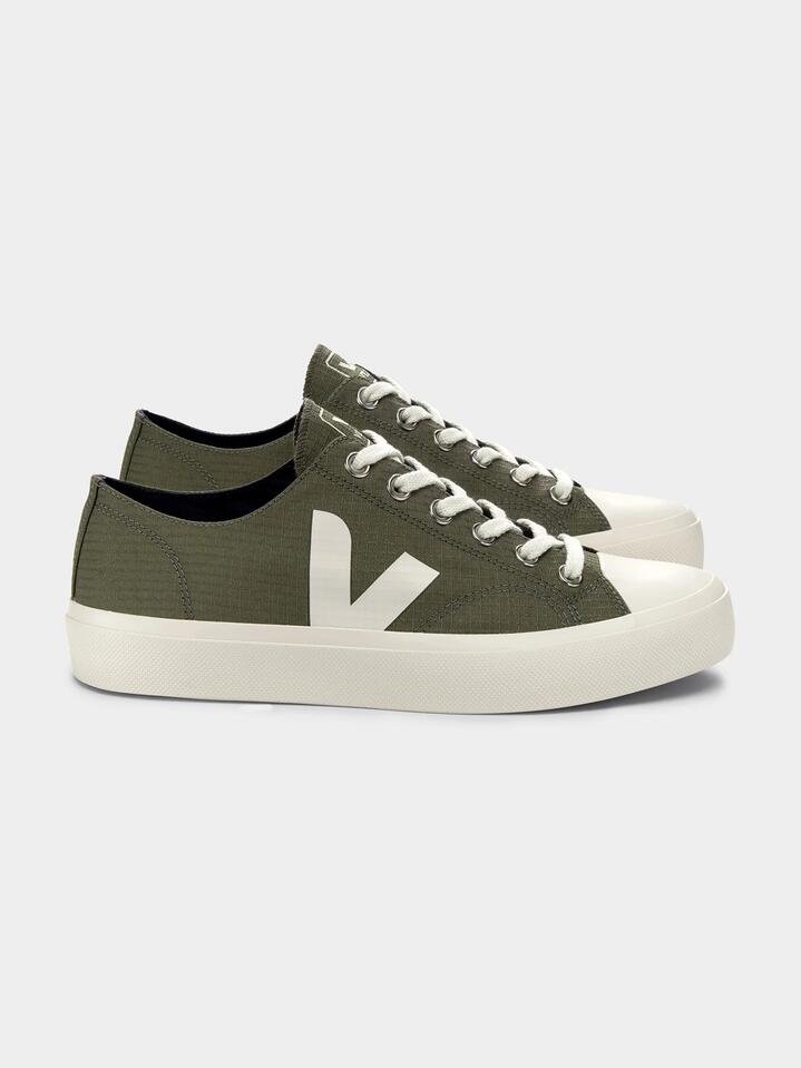 Low top sneakers in khaki & white. Durable canvas uppers made from organic & regenerative cotton. V logo is water based screen print. Amazonian rubber, sugar cane & recycled EVA at insole. Rubber welt & toecap & organic cotton laces. Clean & minimal design with bold contrasting midsole. Materials: Uppers: (100% Organic Cotton) / Insole: (11% Amazonian Rubber, 42% Sugar Cane, 11% Recycled EVA, 12% Organic Cotton) / Outsole: (40% Amazonian Rubber, 10% Recycled Rubber) / Lining & Laces: (100% Organic Cotton). Sizing: All sizes are displayed in EU. Please refer to size chart for conversions.