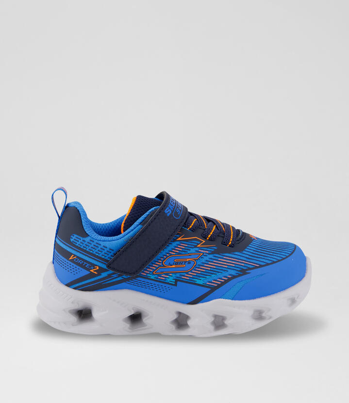 This lighted Skechers adaptive closure design features a lightweight synthetic and mesh upper with a 3D haptic print, stretch laces, an adjustable instep strap, and a cushioned comfort insole.